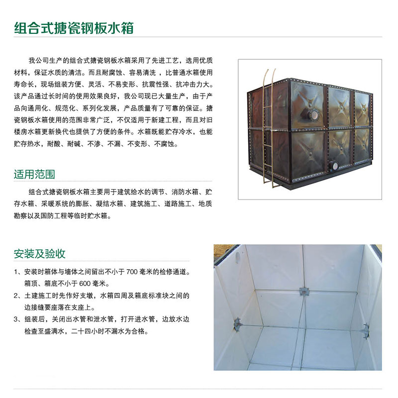 搪瓷水箱,搪瓷水箱、不銹鋼水箱、鍍鋅水箱、人防水箱等產(chǎn)品。高強(qiáng)搪瓷鋼板水箱是采用HSC系列瓷釉作為底釉和面釉涂搪在δ2-δ5鋼板上,板塊經(jīng)燒制后組裝而成的一種新型水箱。其瓷 ...